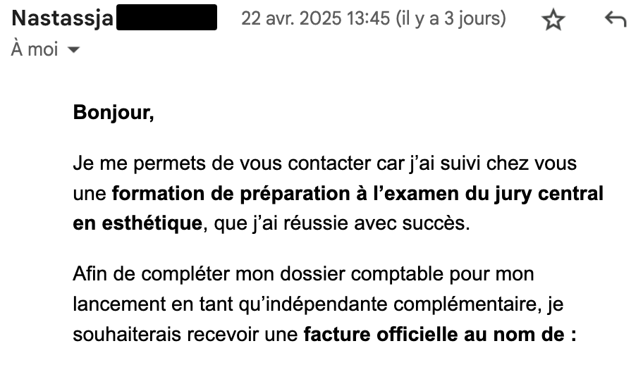 Idéal pour soutenir un projet de reconversion ou un rêve d’institut : vos proches peuvent utiliser le bon sur nos formations en ligne, en présentiel ou privées. 🎓